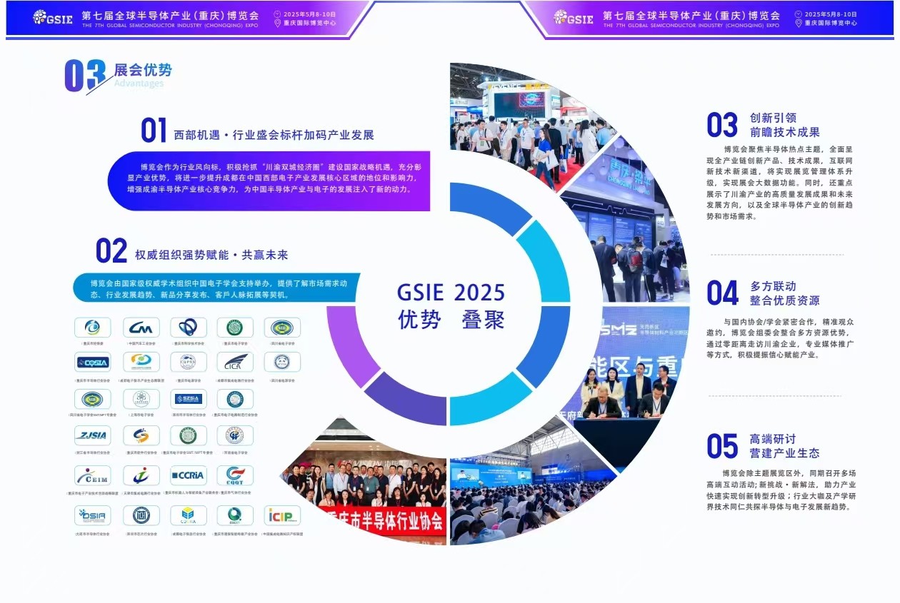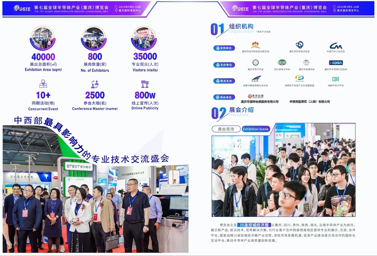 图文详情2024年5⽉7-9⽇,为期三天的第六届全球半导体产业与电⼦技术(重庆)博览会圆满落幕,本届博览会展⽰⾯积30000㎡,参展商达500家,吸引了 23000⼈次专业观众到场参观,同时还有多家主流媒体以不同形式参与盛会的宣传报道。 作为⼀场⾼科技盛会,针对热⻔应⽤领域,向业界展⽰了半导体与电⼦⾏业发展新技术、新产品、新趋势,为推动半导体与电⼦信息产业未来发展 交上⼀份满意的答卷。 上届博览会以“新时代·创造“芯”未来”为主题,汇集集成电路设计、制造、封装测试、泛半导体领域材料、设备、AI+5G、智慧电源、储能技术、电⼦ 智能制造、智慧⼯⼚、测试测量、PCB及电路载体制造、连接器及线束加⼯、电⼦元器件、电⼦和化⼯材料、新型显⽰与智能终端等热⻔领域,为⼤家展⽰ 前沿的科技创新,倾⼒打造从上游基础电⼦元器件到下游产品应⽤端的全产业链阵容